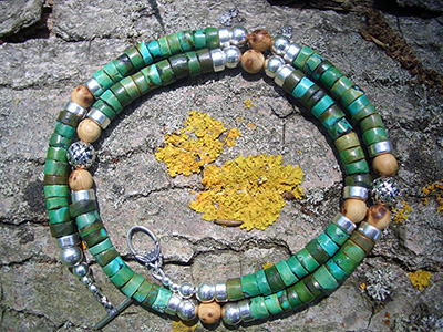 • Türkis, Heishi, unregelmässig, ca. 8-9 mm Durchmesser, grün-braun.