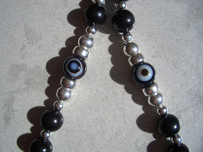 Die Augen-Achat-Perlen sind magische "Bhaisajyaguru Sulemani"-Perlen resp. "Babagoria"-Perlen.